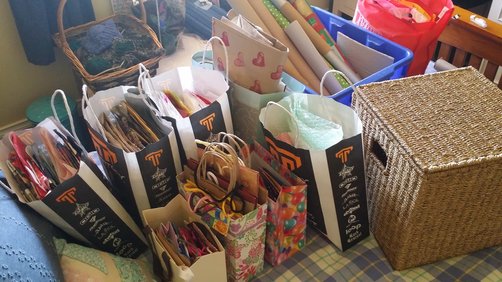 sorted into piles I grabbed the gift bags that were no good for giving gifts in and used them to neatly store the wrapping paper.